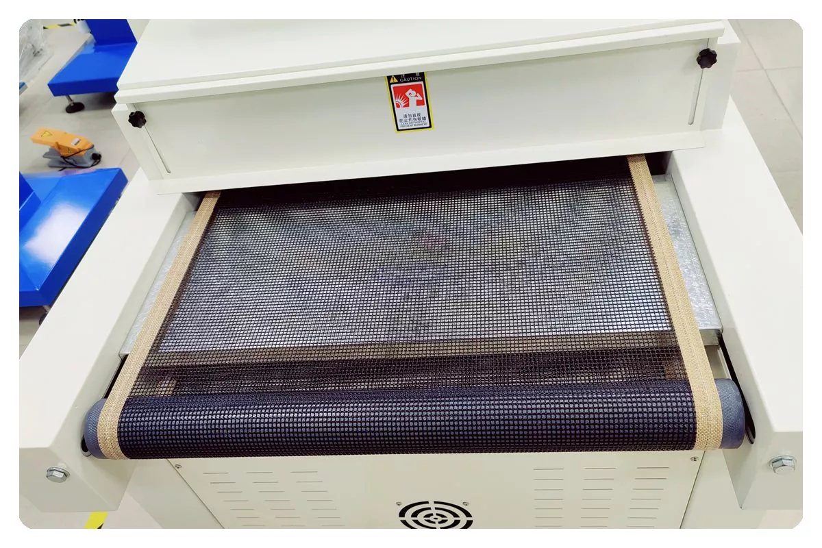 Sabuk conveyor 1000mm Jembar Conveyor UV Curing Machine dikontrol dening motor listrik, lan kacepetan bisa diatur adhedhasar kecepatan produksi sing dibutuhake kanggo cocog karo panjaluk pangatusan sing beda.