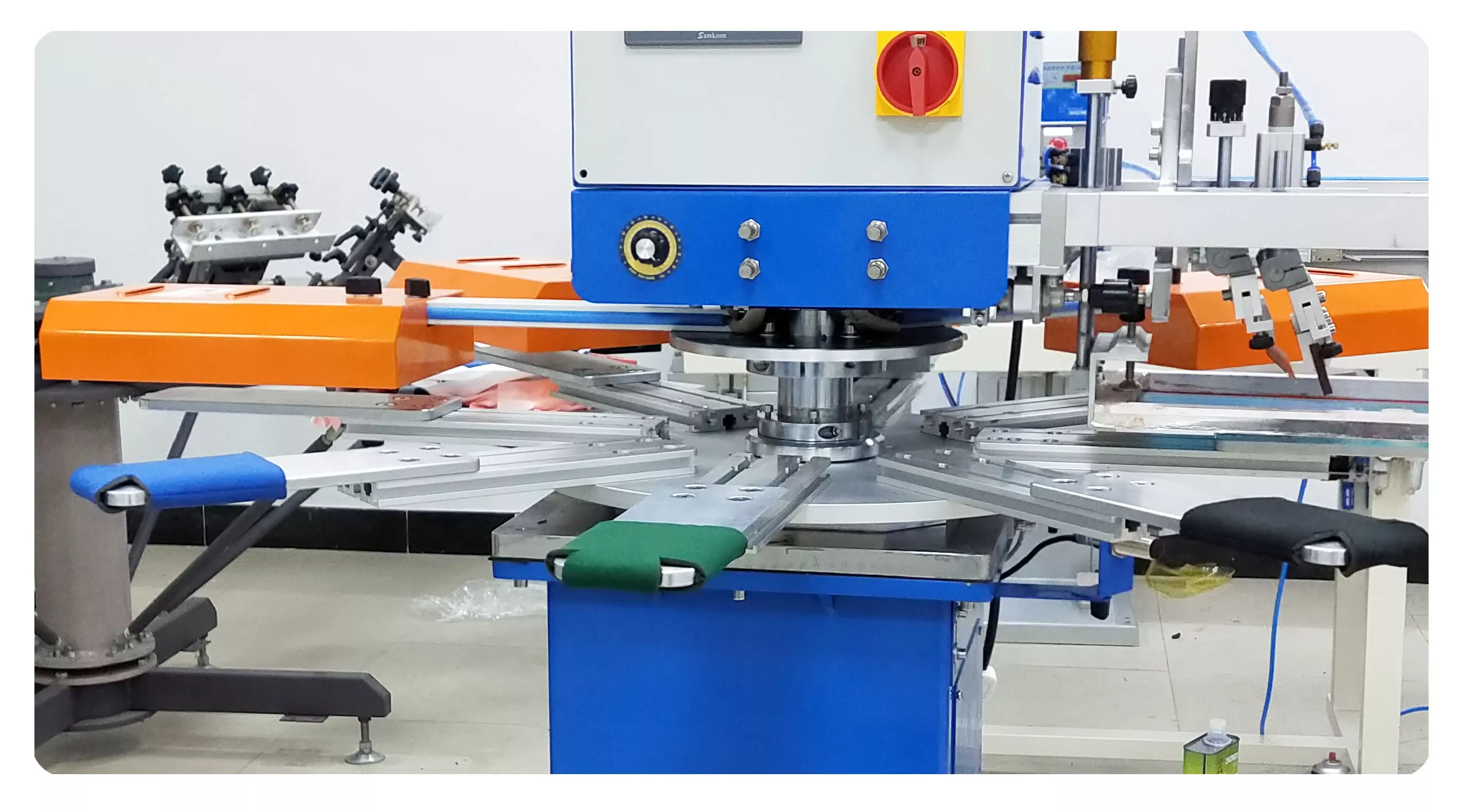 5. Meja kerja Rotary kalebu wolung stasiun: siji kanggo loading, siji kanggo printing, loro kanggo pangatusan, lan siji kanggo unloading, mbisakake limang stasiun bisa ing wektu sing padha.