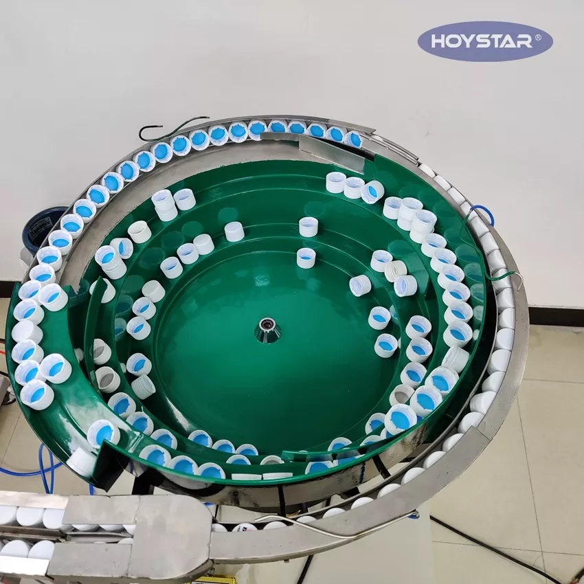 Mesin Percetakan Tutup Botol 2 Warna Otomatis sing dilengkapi feeder geter otomatis bisa nyadari loading otomatis tanpa operasi manual, ngirit tenaga kerja