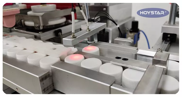 Mesin kasebut dikonfigurasi kanthi sistem perawatan nyala kanggo nambah adhesi tinta ing permukaan tutup botol, nambah daya tahan cetak.