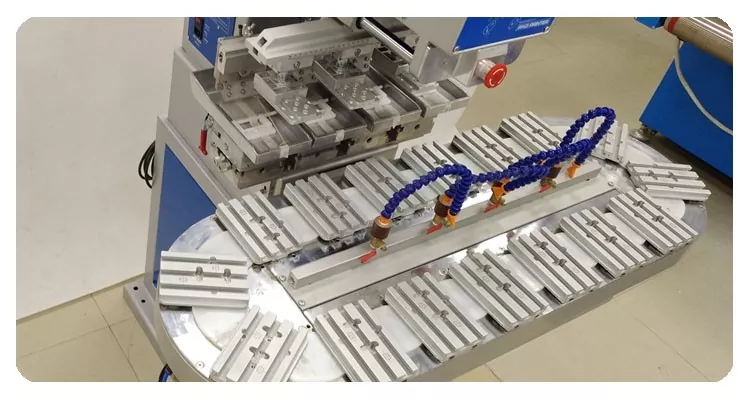 Dilengkapi karo meja rotary, trep kanggo loading lan unloading produk lan nduweni efficiency printing dhuwur