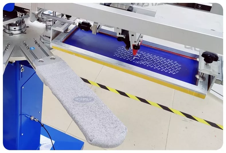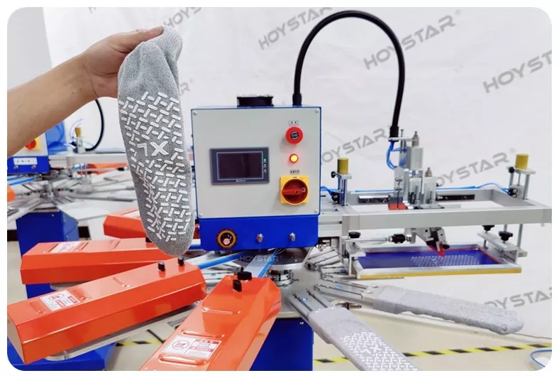 Mesin Cetak Layar Non-Slip kanggo Kaos Kaki dirancang kanggo kaos kaki non-slip berkualitas tinggi kaya kaos kaki bayi, kaos kaki pet, kaos kaki dewasa, kaos kaki bal-balan, kaos kaki genggeman. Cocog kanggo manufaktur sing duwe spesialisasi ing kaos kaki atletik, medis, bocah-bocah, lan yoga sing dituku kanggo dicithak.